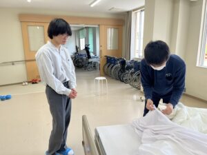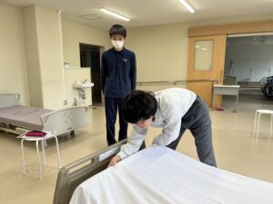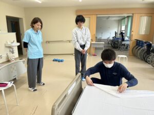 今回の体験授業のテーマは「シーツ交換」